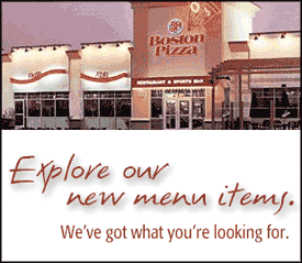 Boston Pizza is a full service, pizza themed, casual dining restaurant and sports bar offering more than 100 menu items including a unique selection of gourmet pizzas, mouth-watering pastas, plus a great variety of appetizers, entrées, meal size salads, sandwiches and desserts.