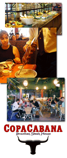 Niagara's first and only Brazilian steakhouse. We specialize in Brazil's most popular style of dining known as churrascaria de rodizio. Our chefs take great pride in offering a vast variety of all you can eat salad bar, hot buffet, and barbecued meats carved table side. We are truly a meat lovers paradise, but we do not forget about vegetarians. We offer a number of non-meat and fish items to satisfy all vegetarian appetites. All of us at Copacabana are confident that your dining experience will be unique and most memorable. Foodinc Reviews "I've been living here in Niagara Falls for 2 year and i can say for sure that this restaurant is the best one here in that city, brasilian carvers are fantastic they really know how to use a sharp knife, our party turned much better after eating at Copa, next time when i fell really hungry i know where i have to go, 34.95 is nothing for that much of food, a terrific food by the way!!" Sat Aug 27 02:43:08 2005 "The meat was fabulous! 10 different kinds! We only made it up to 7 types before we were too full. There was no salt and pepper on the table, and nothing needed it! It was that tasty. Interesting way to get service, flip your coaster to the green side for more meat, and to the red side when you are done. The service is fast to your table with meat cut right in front of you, buffet had a great selection of sides, and anti-pasto dishes. The entertainment was amazing! Brazilian dancers, and fantastic music. It made for a wonderful evening!" Mon Aug 15 15:04:20 2005 "Something good and different for a change. Love the table-side sevice. They just keep coming with different meats. Wife loved the sugard pineapple. Great entertainment as well." Fri May 13 10:55:52 2005 "I had the best steak & prime-rib of my entire life at this fine place " Thu Feb 24 15:59:03 2005 |