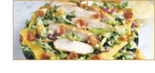 Tender all white chicken strips and cheddar cheese are laid across a generous bed of mixed greens. Pile on Bacon bits, garlic cheese croutons, and Hone mustard Dressing for a taste thats light yet hearty. Served with Parmesan Ggarlic Toast.