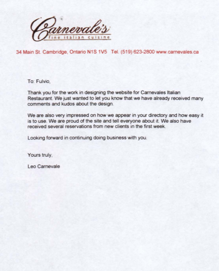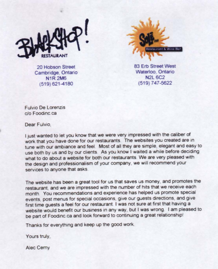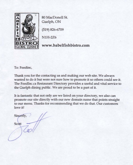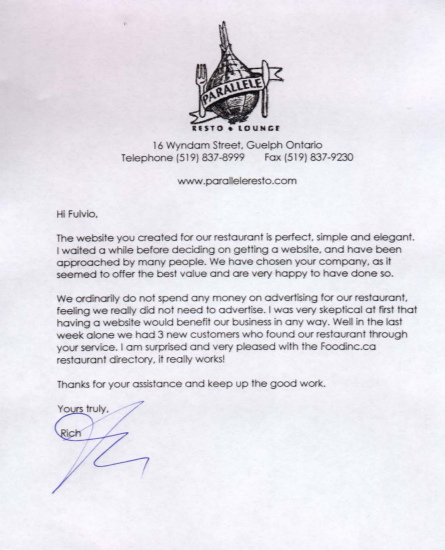 Restaurant owners are some of the most savvy and businnes minded people anyone could encounter. Owning or running a restaurant is a tough business and owners/managers know it. This is why testimonials from our clients mean so much to us. It shows us that our website is effective and it does drive traffic to restaurants. Below are some of the testiminoals that Foodinc.ca has received.